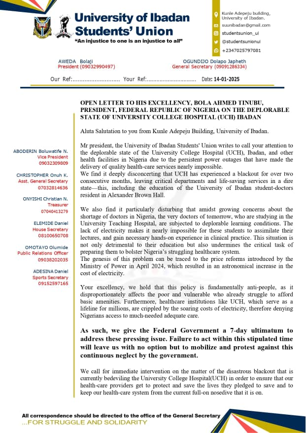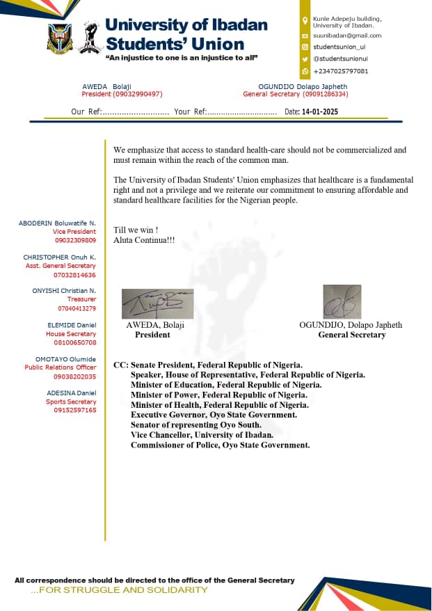 The 1st page of a letter from the UI SUG to President Tinubu on the poor living conditions in UCH (Photo: UI SUG)